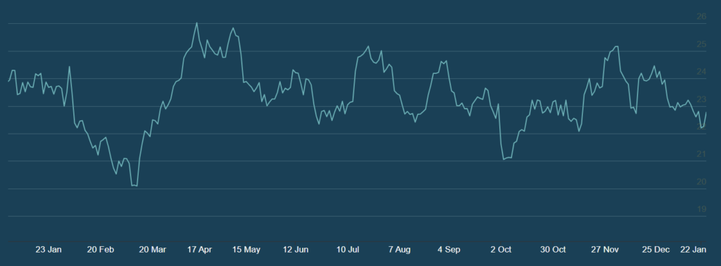 Gibanje cene srebra v USD za trojsko unčo (LBMA popoldanski fiksing), januar 2023-januar 2024