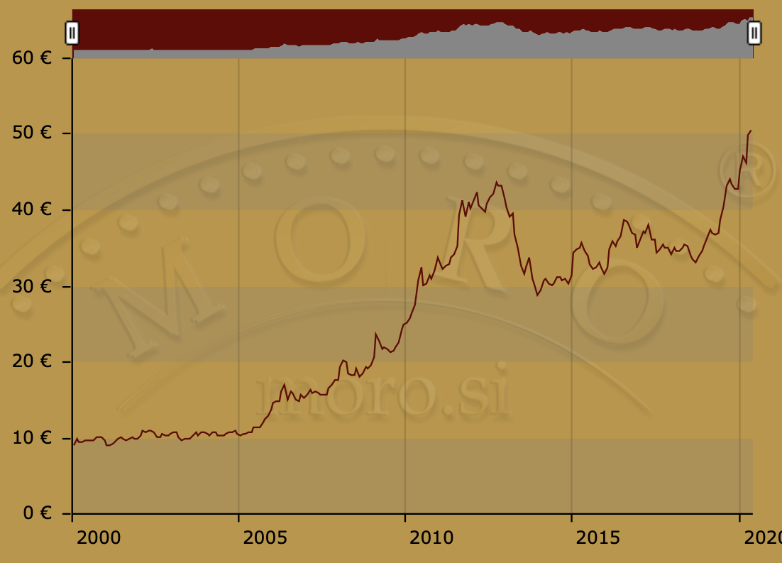 Gibanje cene zlata v obdobju od leta 2000 do danes, v EUR za gram