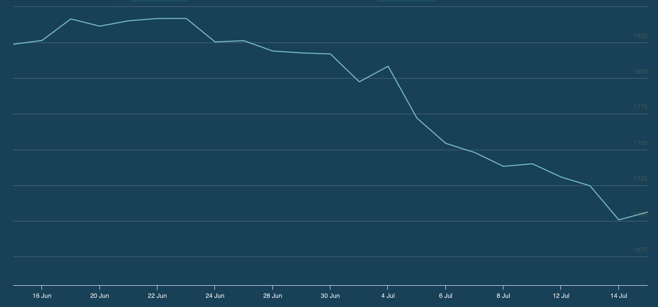 Gibanje cene zlata v USD/oz v zadnjem mesecu (LBMA popoldanski fiksing)