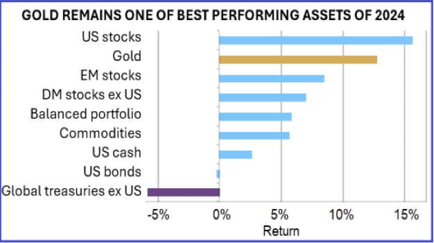 Padec obrestnih mer in posledično vrednosti ameriškega dolarja sta v juliju pozitivno vplivala na ceno zlata, ki je dosegla novo rekordno vrednost v višini 2.480,25 ameriških dolarjev za trojsko unčo (17. julij, LBMA popoldanski fiksing). Vrednost zlata se običajno giblje v nasprotni smeri kot višina obrestnih mer in vrednost dolarja. Od oktobra 2023 dalje so vrednost dolarja in obrestne mere v fazi padanja oz. stagnacije, od takrat pa je vrednost zlata močno narasla in dosegla nove rekordne vrednosti. Spodnja slika kaže donose posameznih finančnih naložb v letu 2024. Iz slike je razvidno, da je v letošnjem letu zlato druga najdonosnejša naložba, takoj za ameriškimi delnicami (merjeno glede na donos indeksa S&P 500), ki pa so bistveno bolj tvegana naložba. Srebro na sliki ni prikazano, vendar če bi bilo, bi bilo dejansko na drugem mestu, saj je v tem letu doseglo še nekoliko višji donos kot cena zlata.