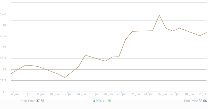 Gibanje cene zlata v zadnjih 30 dneh, v evrih / gram