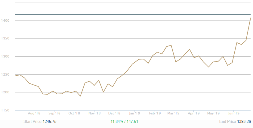 Cena zlata je presegla drseče povprečje zadnjih 23 mesecev in tehnično mejo 1.385 dolarjev za trojsko unčo, kar pomeni, da je cena v novem bikovskem trendu. Junijska novica, da bo Fed v prihodnje dodatno zniževala obrestne mere, je povzročila premike na mnogih finančnih trgih in povečala nezaupanje v Fed in druge centralne banke ter v njihovo sposobnost obvladovanja tveganj. Odločitev o nadaljnjem znižanju obrestnih mer je bila rezultat negotovosti v povezavi z napetostmi med ZDA in Kitajsko ter slabših napovedi glede gibanja stopnje inflacije v prihodnje. Mednarodni denarni sklad je medtem korigiral oceno globalne  gospodarske rasti s predhodnih 3,5 na 3,3 odstotka, kar je tudi pripomoglo k rasti cene zlata.