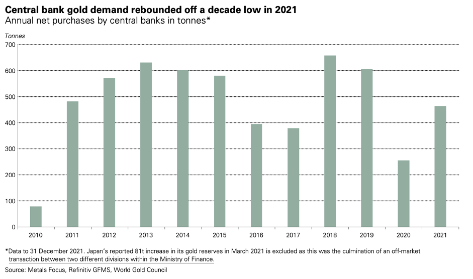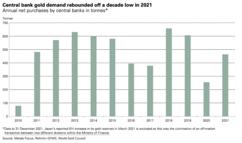 V letu 2021 so centralne banke povečale monetarne zaloge zlata za 463 ton na globalni ravni, kar je kar 82 odstotkov več kot leto prej. Celotne zaloge monetarnega zlata so ob koncu leta 2021 znašale 35.600 ton, kar je največ v zadnjih 30 letih. Centralne banke že od leta 2010 naprej kupijo bistveno več zlata kot ga prodajo. Neto nakupi centralnih bank, izraženi v tonah, so prikazani na spodnjem grafu. Centralne banke se zavedajo ključnega pomena, ki ga ima zlato v portfelju institucionalnih in pa tudi posameznih investitorjev, kar se odraža v njihovih neto nakupih.