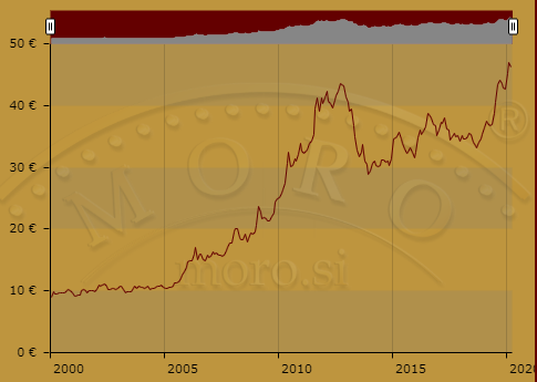 Gibanje cene zlata v obdobju od 2000 do 2020, v €/g