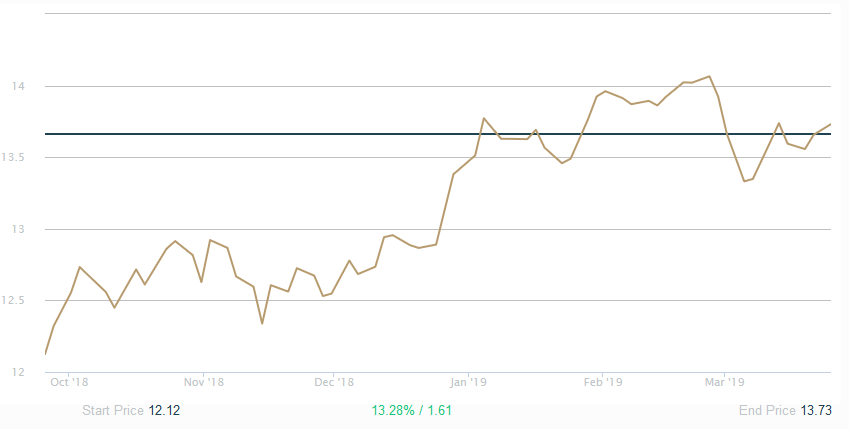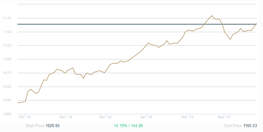 Najvišjo vrednost je zlato letos doseglo 19. februarja, 1.344,80 dolarjev za trojsko unčo. Sledila je manjša korekcija na račun močnega dolarja, ta pa je na vrednosti pridobival zaradi šibkega evra. Evrska cena zlata je, gledano na zadnje desetletje, dosegla dno leta 2013. V zadnjih šestih mesecih je evrska cena zlata dosegla porast v višini 14,19 odstotka, kar je vidno na grafu spodaj. K rasti cene zlata v zadnjih mesecih prispevajo tudi nizke obrestne mere.