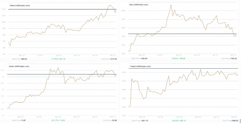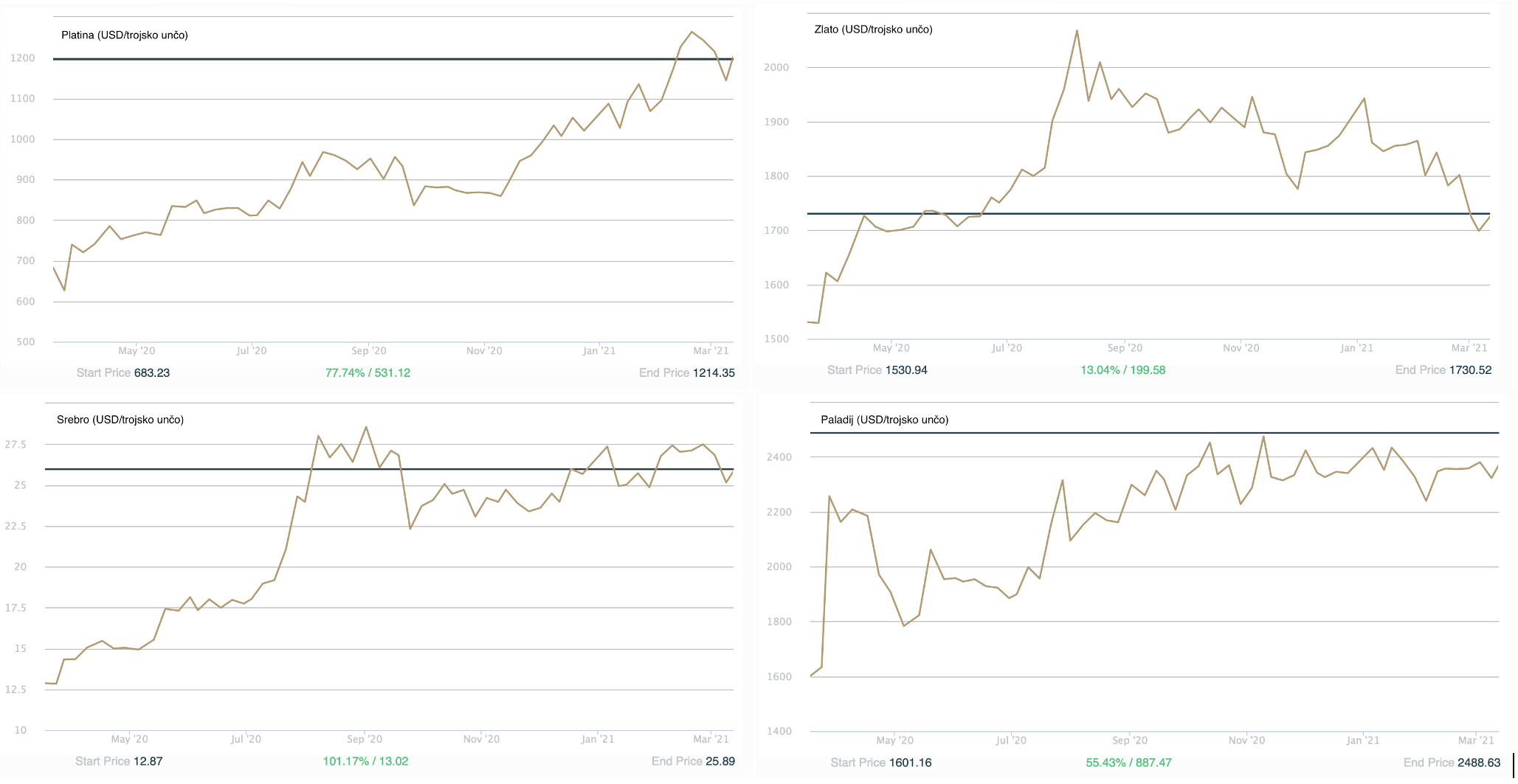 Če pretekli ceni srebra in platine primerjamo s ceno zlata lahko ugotovimo naslednje: v sedemdesetih in osemdesetih letih je bila cena zlata v primerjavi s ceno srebra in platine bistveno višja in je dosegala višje stopnje rasti. Povedano drugače, kazalnika zlato/srebro in zlato/platina sta rasla. Trend se je obrnil v devetdesetih letih, ko je zagon dobila cena platine in rasla vse do leta 2008 ter cena srebra, ki je do leta 2011 dosegala izjemno rast. Po letu 2008 je cena platine doživela večjo korekcijo in si pravzaprav ni opomogla do lanskega novembra. Medtem je zlato med leti 2011 in 2020 ponovno zavzelo vodilno vlogo med plemenitimi kovinami in doseglo rekordno vrednost avgusta 2020. Vodilno ni bilo le v dolarskem smislu, vendar tudi napram ceni srebra in platine. Približno leto nazaj sta v ospredje ponovno prišla srebro in platina. Gre za dve obetavni plemeniti kovini za dolgoročno investicijo, katerih povpraševanje raste tudi na osnovi rastočega industrijskega povpraševanja. Srebro ima še veliko prostora za rast cene, tehnična meja je trenutno pri 30 dolarjih za trojsko unčo. V kolikor jo preseže, lahko cena nadalje poskoči krepko čez 35 dolarjev za trojsko unčo, kot je navedeno v poročilu The Aden Forecast. Cena paladija še naprej dosega visoke vrednosti, a lahko pride do korekcije v kratkem.