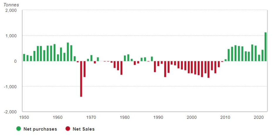 Po podatkih organizacije World Gold Council, je v letu 2022 povpraševanje centralnih bank po zlatu doseglo rekordnih 70 milijard ameriških dolarjev, kot je razvidno tudi iz zgornjega grafa. Evropske banke so s prodajo monetarnega zlata zaključile že v času zadnje finančne krize in od septembra 2008 dalje le še kupujejo dodatne količine monetarnega zlata. V istem obdobju so države v razvoju začele s strateškimi nakupi monetarnega zlata, vključno z Rusijo, Turčijo in Indijo.