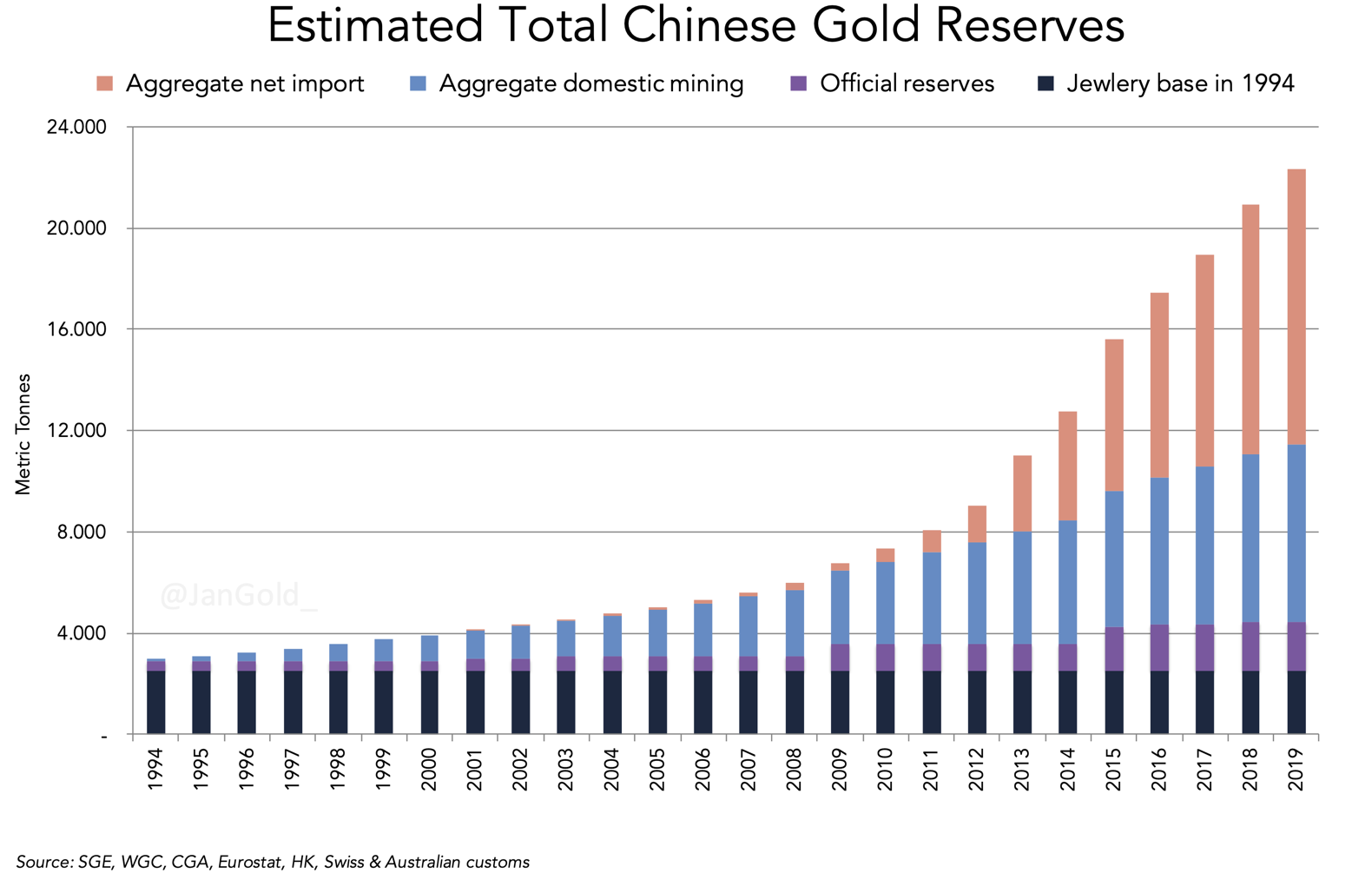 Kitajska ima na trgu zlata pomembno vlogo, nastopa tako na ponudbeni strani kot tudi na strani povpraševanja. Kitajska zagotavlja največji delež povpraševanja po fizičnem zlatu (26 odstotkov) in hkrati proizvede največjo količino zlata letno. Uradne monetarne rezerve in količina zlata v lasti družin in posameznih investitorjev na Kitajskem ostaja uganka, v spodnjem grafu pa je na podlagi različnih virov prikazana ocenjena trenutna količina zlata na Kitajskem. Po podatkih World Gold Council je na drugem mestu v povpraševanju po zlatu Indija z 22 odstotki. Globalno povpraševanje po investicijskem zlatu je v skladu z nizkimi obrestnimi merami in negotovimi razmerami izjemna. V letošnjem letu je sicer nekoliko padlo povpraševanje po zlatem nakitu na račun zaprtja draguljarn in zlatarstev zaradi ukrepov Covid-19.