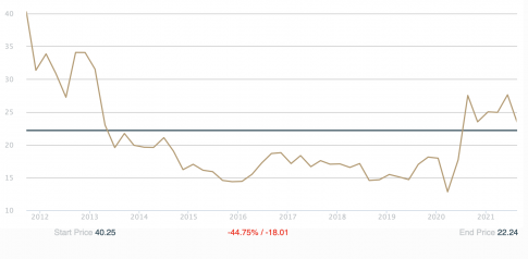 Gibanje cene srebra v zadnjih desetih letih, v USD za trojsko unčo