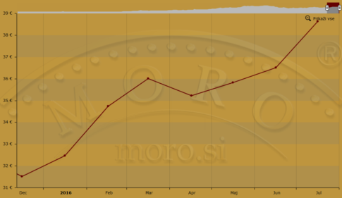 Graf prikazuje povrečne mesečne borzne cene zlata v €/g
