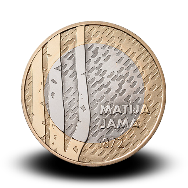 Osrednji motiv zbirateljskih kovancev ob 150. obletnici rojstva slikarja Matije Jame so tri debla mladih brez. Predstavljajo mladega človeka, umetnika in slikarja, ki se podaja na samostojno ustvarjalno pot. Poteze čopiča ustvarijo osnovo nežnega reliefno razgibanega ozadja in spominjajo na površino impresionističnih slik, prikazujejo pa tudi nomadsko življenje slikarja. Avtor likovne rešitve kovancev je Matej Štanta. Na voljo bodo naslednje količine zbirateljskih kovancev: