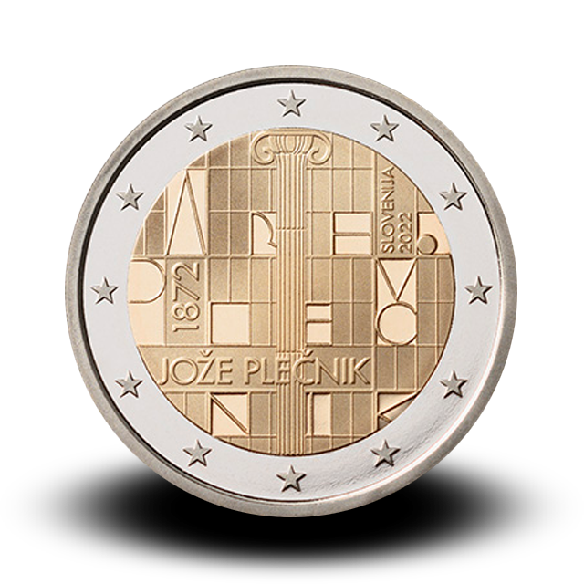 Osrednji motiv spominskega kovanca ob 150. obletnici rojstva arhitekta Jožeta Plečnika je veliko čitalniško okno Narodne in univerzitetne knjižnice v Ljubljani s stebrom pred njim. Kompozicija znakov A R H. P L E Č N I K je vgrajena v prostor okna in je metafora za arhitektov podpis. Avtor likovne rešitve je Andrej Žerovnik. Na voljo bodo naslednje količine spominskega kovanca: