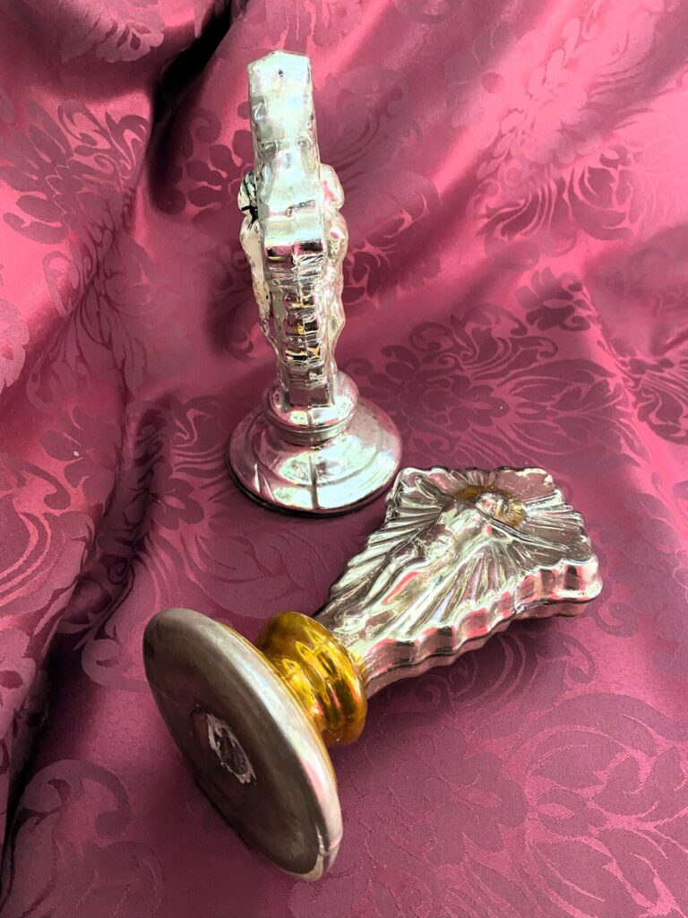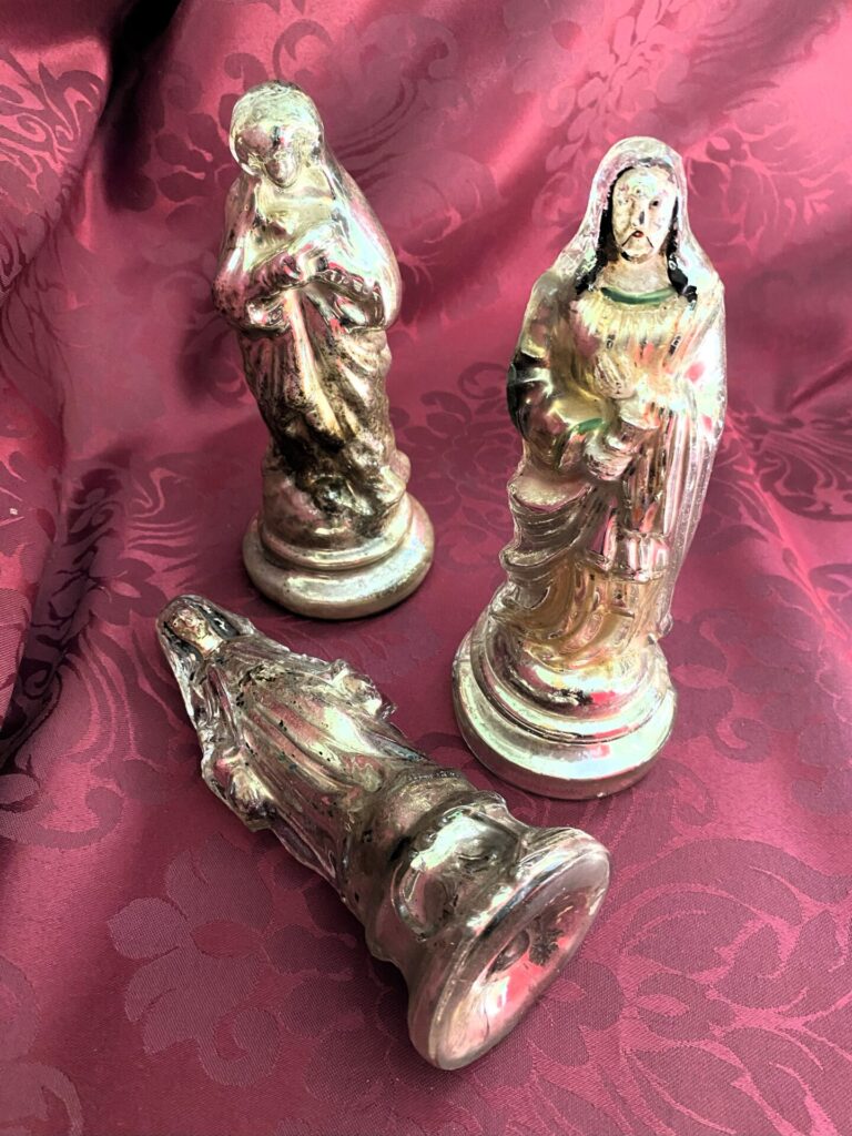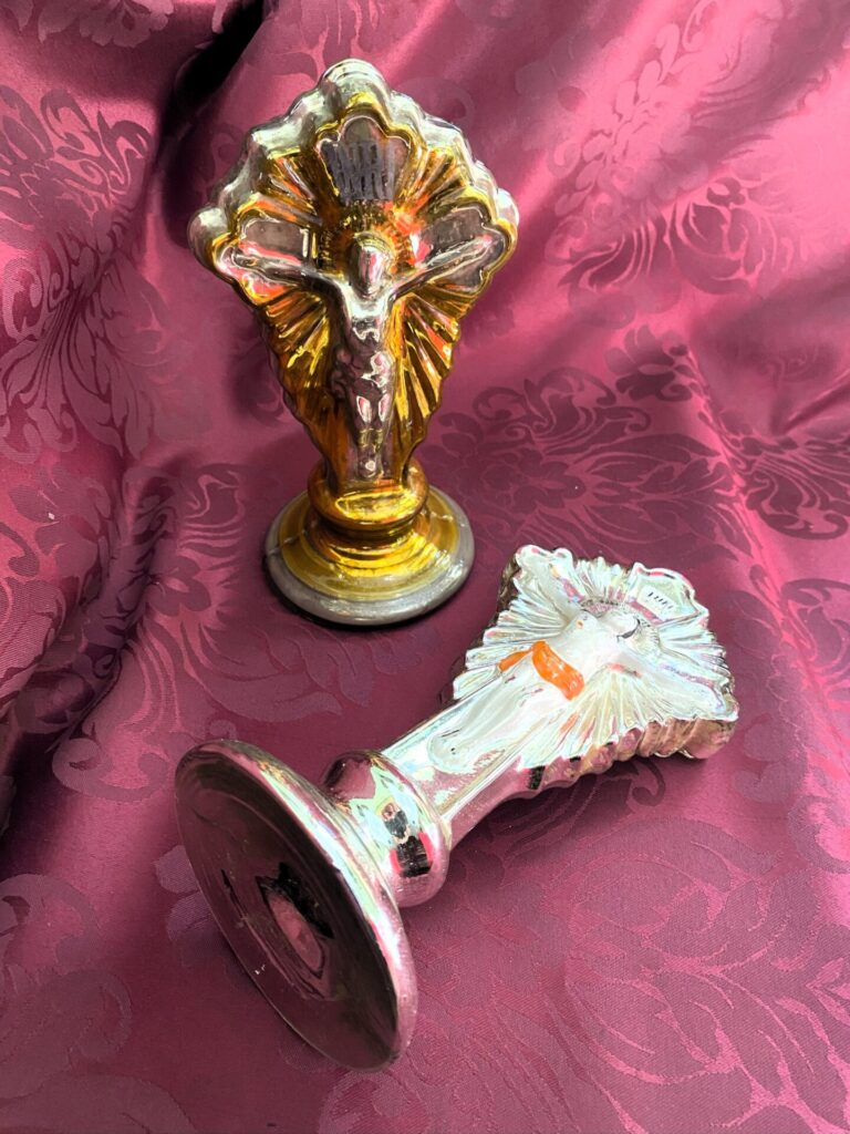 Tudi različne oblike razpel so bile izdelane iz stekla z notranjim srebrnim premazom, pogosto okrašena s pozlato in patino, ki je poudarila trpljenje in svetost. Uporabljali so jih v domačih molitvenih kotičkih, zlasti na podeželju, kjer si ljudje niso mogli privoščiti dragih cerkvenih kipov. Primerni so bili tudi za okrasitev božičnih drevesc, saj so prav čarobno odbijali svetlobo plamenečih sveč.