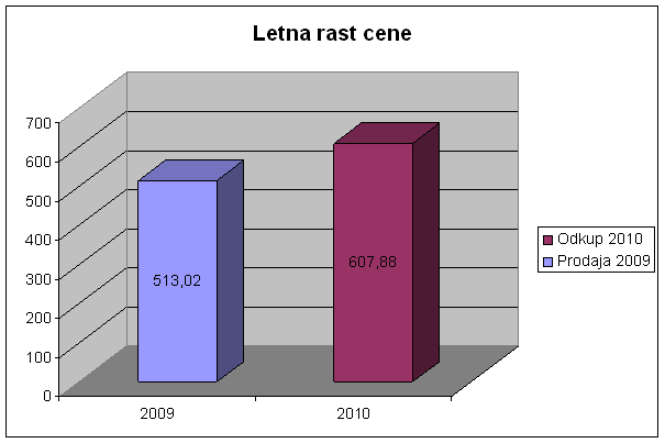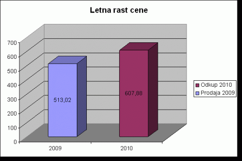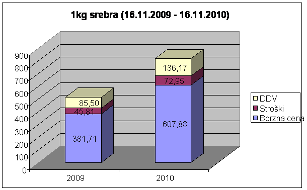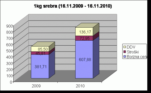 Na grafu lahko vidite, da je bila 16.11.2009 borzna cena za 1000g srebra 381,71 €. V družbi Moro ste ga kupili za 513,02 € (vključno z 20 odstotnim DDV). Leto kasneje, 16.11.2010, je odkupna cena 1000g srebra borzna cena, kar znaša 607,88 €.