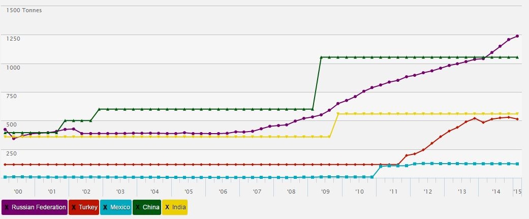 Rusija je leta 2014 v količini zlatih rezerv prehitela Kitajsko, največjo porabnico zlata v svetu. Rusija že od leta 2006 naprej povečuje svoje zlate rezerve, ki trenutno znašajo 1.246 ton. V primerjavi z letom 2005 je Rusija povečala zlate rezerve za 222 odstotkov. Kitajska ima po uradnih podatkih trenutno v rezervah 1.054 ton zlata, kar je 75 odstotkov več kot v letu 2005. Kitajska je v obdobju od 2003 do 2009 v rezerve dodala 454 ton zlata, nakup pa je objavila aprila 2009.