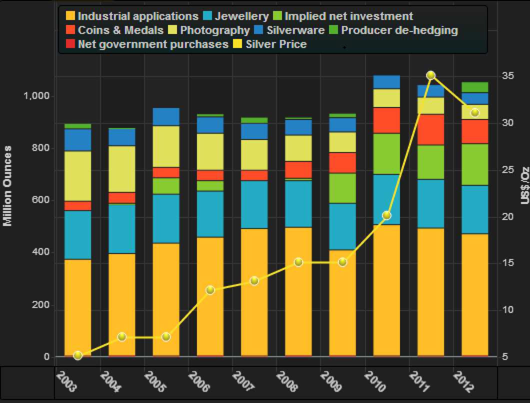 V maju se je cena srebra gibala med 21,9 in 24,4 dolarji za trojsko unčo, trenutno znaša cena 21,8 dolarjev. Povpraševanje na trgu fizičnega zlata se je ob padcu cene povečalo, a manj kot na trgu zlata. Glede na nestabilne gospodarske in politične razmere v svetu investitorji ostajajo pazljivi, na trgu vrednostnih papirjev vezanih na srebro prevladujejo kratke pozicije.