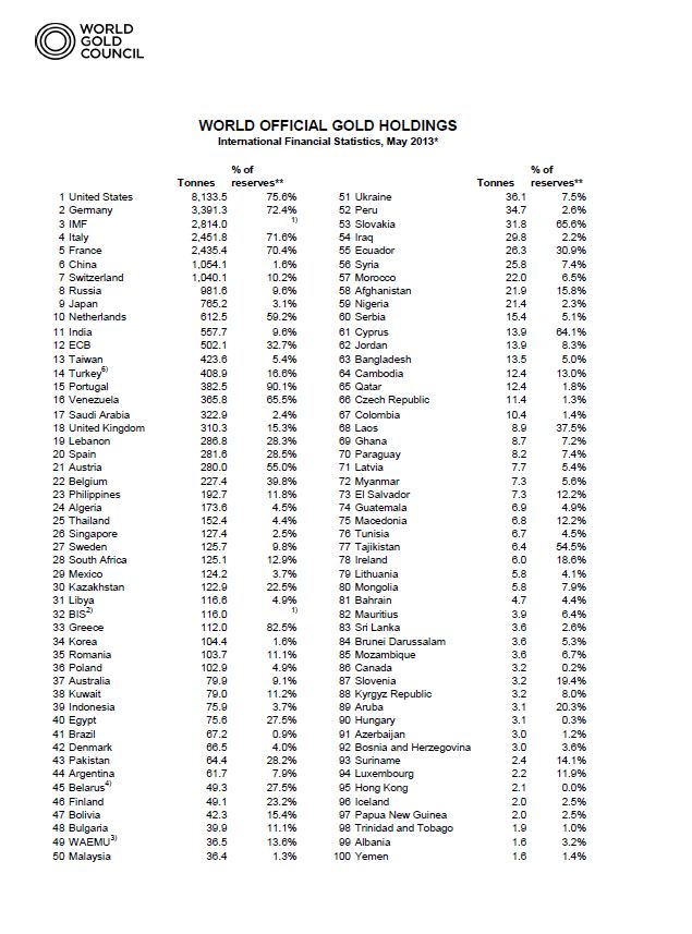 Centralne banke kupujejo zlato. Kljub ugibanjem, da bo morala Ciprska centralna banka na osnovi zahteve Evropske komisije prodati 10 ton zlata, se to ni zgodilo. Zelo majhna verjetnost je, da se bo to zgodilo tudi v prihodnje, saj v skladu z ustavo EU politični vpliv na monetarno politiko centralnih bank ni dovoljen. Centralne banke naj bi bile politično neodvisne, zato prodaja zlatih rezerv ni potrebna, ne glede na priporočila Evropske komisije. Tudi če bi do prodaje prišlo, to ne bi vplivalo na borzno ceno zlata. Po mnenju strokovnjakov raziskovalnega inštituta Thomson Reuters GFMS oziroma upoštevajoč nizko likvidnost finančnih trgov in težav ZDA s primanjkljajem, bi lahko bili priča stabilizaciji cene do sredine letošnjega leta. Razlog je v povečanem povpraševanju po fizičnem zlatu, hkrati trg pričakuje slaba makroekonomska poročila več držav.