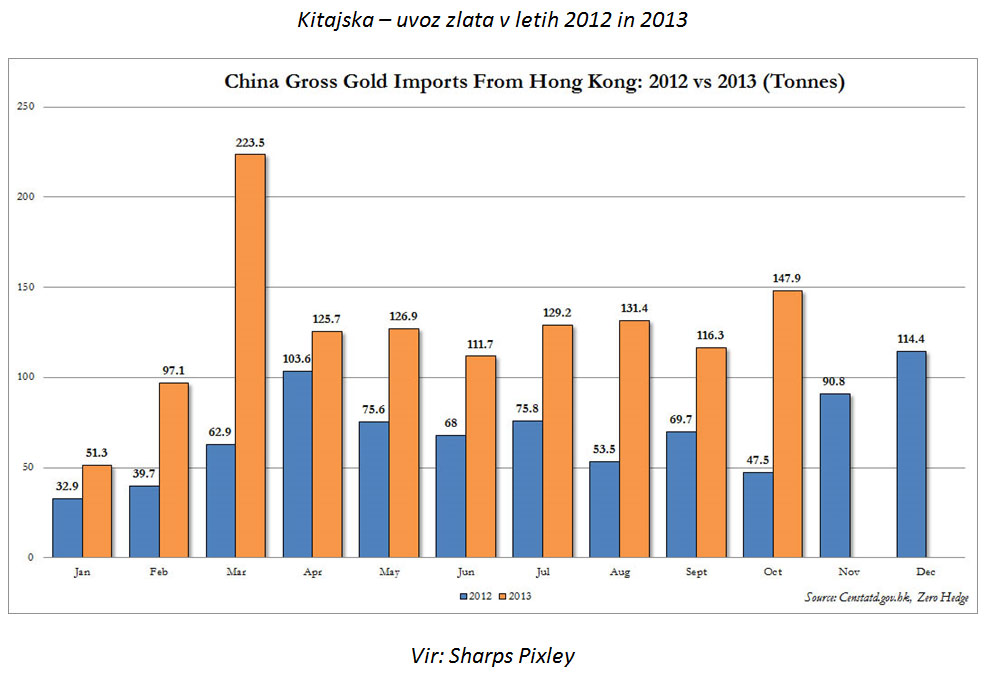 S padanjem cene zlata od aprila letos se je močno povečalo povpraševanje po fizičnem zlatu. Trend se nadaljuje predvsem v Indiji in na Kitajskem. Zheng Lianghao iz World Gold Council je v začetku decembra na mednarodni konferenci v Šanghaju napovedal, da bo na Kitajskem do konca leta povpraševanje po fizičnem zlatu preseglo ponudbo za 700 – 800 ton. Na račun padca cene se je na Kitajskem povpraševanje po nakitu in bullion proizvodih povečalo za 40 odstotkov. V oktobru je Kitajska izkoristila 30 odstotni padec cene zlata in uvozila 148 ton zlata, rekordnih 224 ton je uvozila marca. V zadnjih 26 mesecih je Kitajska uvozila skupaj 2380 ton zlata. Količina zlatih rezerv Kitajske (1.054,1 ton oziroma 2 do 3 odstotke mednarodnih rezerv) se v zadnjih petih letih uradno ni spremenila, a dejanska količina ostaja skrita in nerealna.