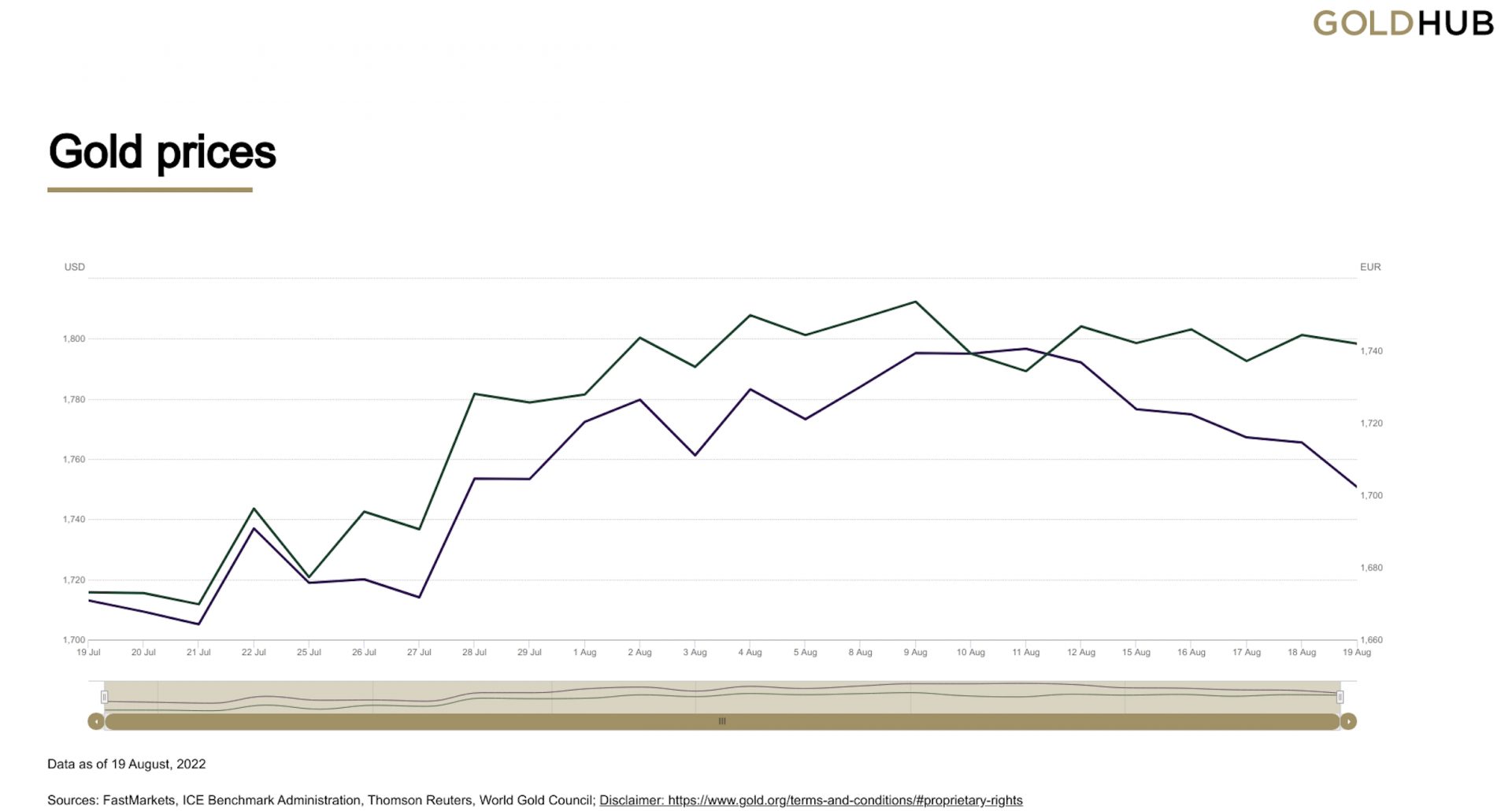 Gibanje cene za unčo zlata v zadnjih 30 dneh (v EUR – zelena linija, v USD – modra linija)