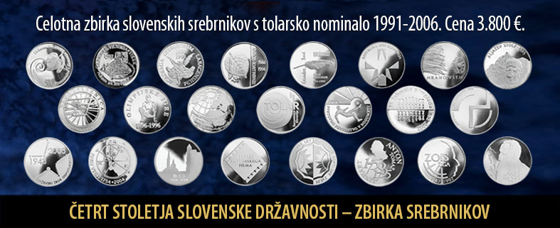 Cenjene stranke obveščamo, da je v prodaji celotna zbirka slovenskih priložnostnih srebrnikov s tolarsko nominalo. Kovanci so bili izdani med leti 1991 in 2006. Srebrnike lahko kupite tudi kot sliko, saj je 24 kovancev upetih na temno moder žamet in uokvirjenih. Zbirka je del naše zgodovine in hkrati lepo poslovno darilo.