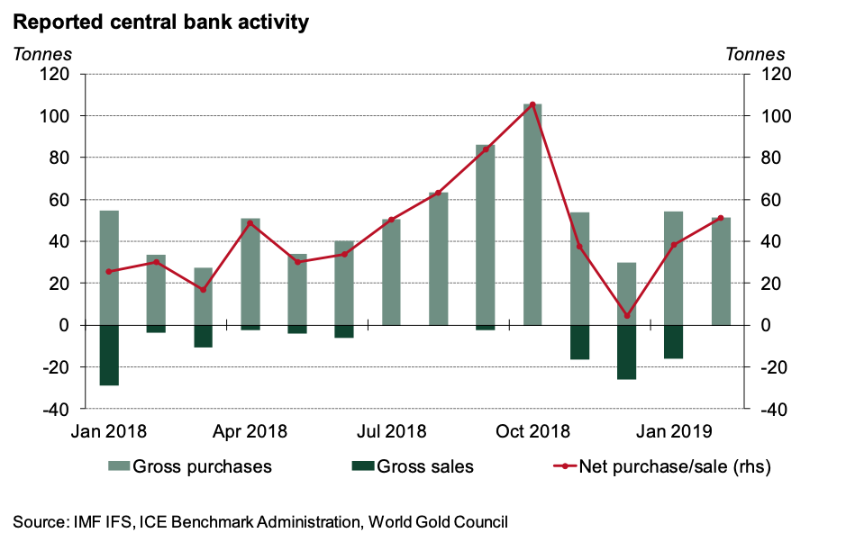 Na svetovni ravni so centralne banke v februarju 2019 neto povečale zaloge zlata za 51 ton (kot je vidno na spodnjem grafu), kar je največ od oktobra 2018, ko so v zaloge dodale neto 105 ton. Prodaja monetarnega zlata s strani centralnih bank je v februarju dosegla le 0,2 toni. V januarju in februarju letos so centralne banke v zaloge dodale skupno 90 ton monetarnega zlata (56 ton v istem obdobju lani), kar je največ od leta 2008. Torej, centralne banke, posebej tiste v državah v razvoju, povečujejo zaloge zlata konstantno in načrtovano.