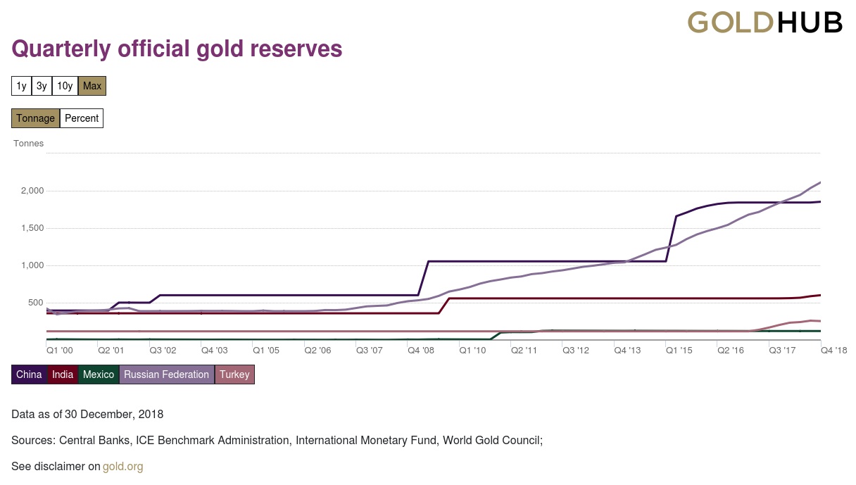 Slika spodaj prikazuje spremembe količine monetarnega zlata po izbranih državah. V letu 2018 je centralna banka Rusije povečala zlate rezerve za kar 275 ton, in dosegajo 2.150,50 ton. Med januarjem in februarjem letos je v zlate rezerve dodala še 31,3 tone zlata. Monetarno zlato v mednarodnih ruskih rezervah dosega skoraj 20 odstotkov. Rusija je monetarne rezerve v ameriških dolarjih od leta 2017 do danes zmanjšala s prvotnih 46 odstotkov na trenutnih 22 odstotkov. V lanskem letu je Rusija prehitela Kitajsko v količini zlatih rezerv in postala peta država z največ zlata. Na prvem mestu so ZDA z 8.133,50 tonami, sledijo Nemčija s 3.369,70 tonami, Italija z 2.451,80 tonami in Francija z 2.436,00 tonami. Guvernerka ruske centralne banke, Elvira Nabiullina, poudarja, da centralna banka vodi politiko razpršitve tveganja, pri čemer upošteva vse dejavnike tveganja, finančni, ekonomski in geopolitični.