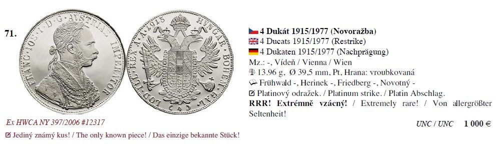 Dukat štirikratni – pokov, kovanje v platini, edini znani primerek, dosežena cena 4.200 €
