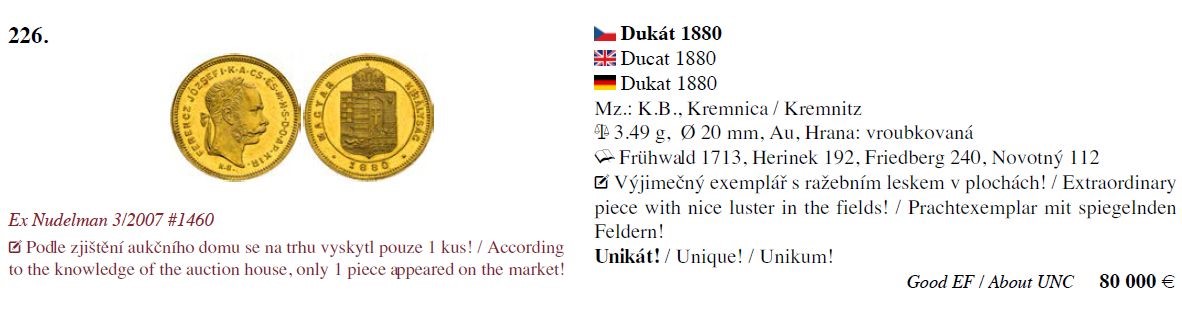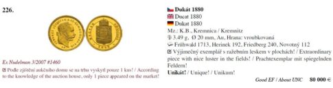Zlatnik Dukat enkratni l.1880, madžarski kov, edini znani primerek na trgu, dosežena cena 120.000 €