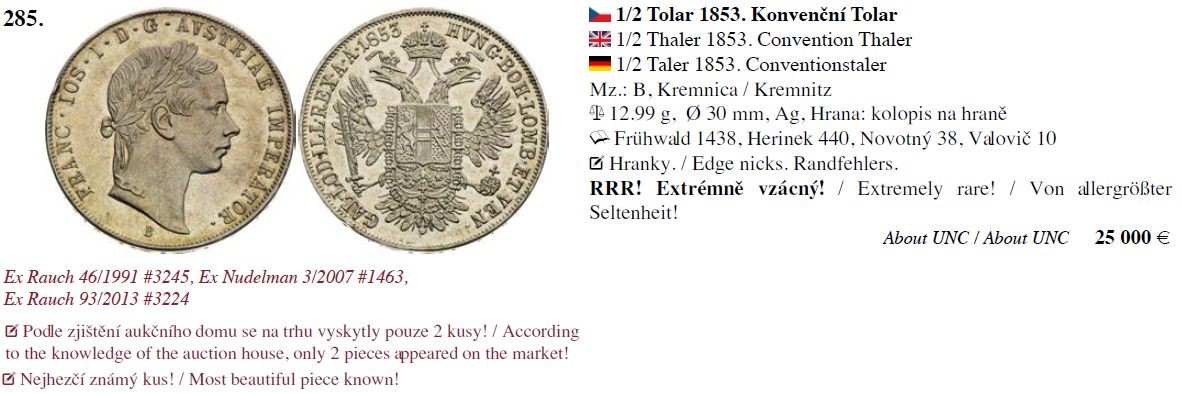Srebrnik Konvenčni 1/2 Taler l.1853, dosežena cena 28.000 €