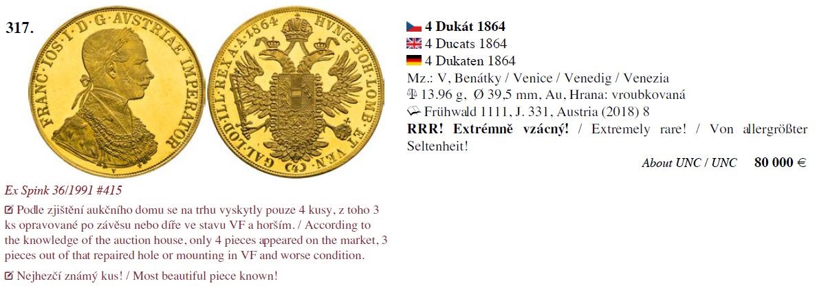Zlatnik Dukat štirikratni l.1864, dosežena cena 130.000 €