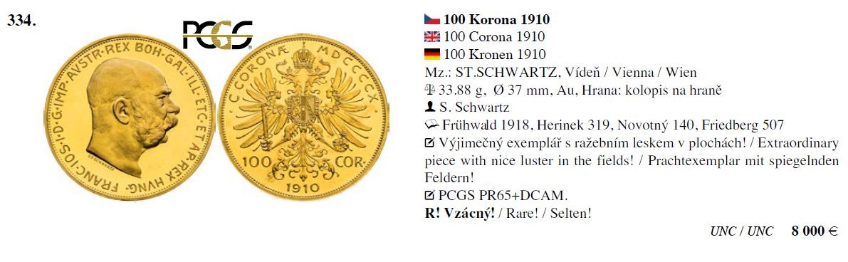 Zlatnik 100 kron l.1910, dosežena cena 20.000 €