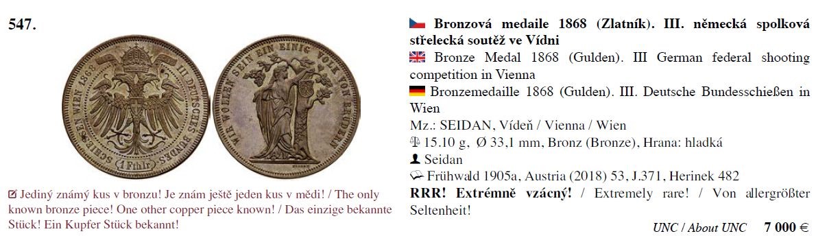 Bronasta medalja l.1868, strelsko tekmovanje na Dunaju, dosežena cena 10.000 €