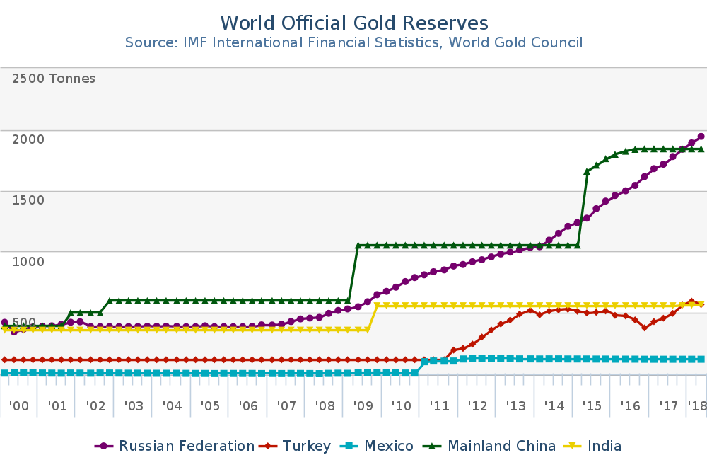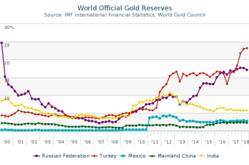 Objavljamo zanimiva grafa, ki prikazujeta tako povečanje zlatih rezerv, kjer prednjačita Rusija in Kitajska, kot tudi države, kjer je odstotek rezerv v zlatu najvišji, in sicer v Turčiji in Rusiji.