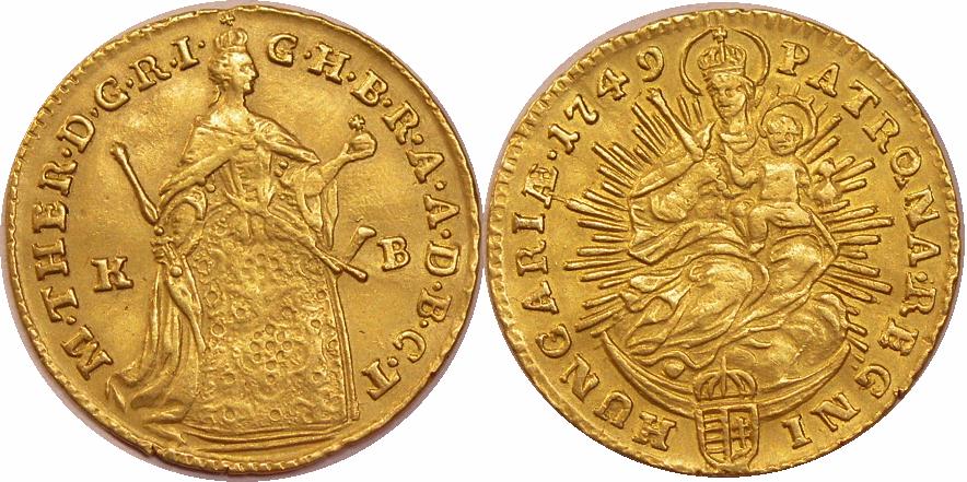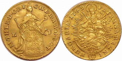 Rv : Marija z detetom kot zaščitnica Ogrske. Pod podobo, po kateri je zlatnik dobil ime, je ogrski grb.