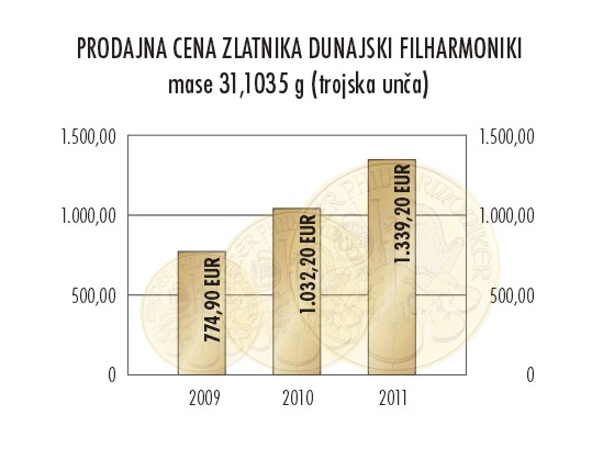 Eden najboljših pokazateljev zapisanega je rast cene zlata v zadnjih treh letih. Navajamo prodajno ceno zlatnika Dunajski filharmoniki, mase 31,1035 g (trojska unča):