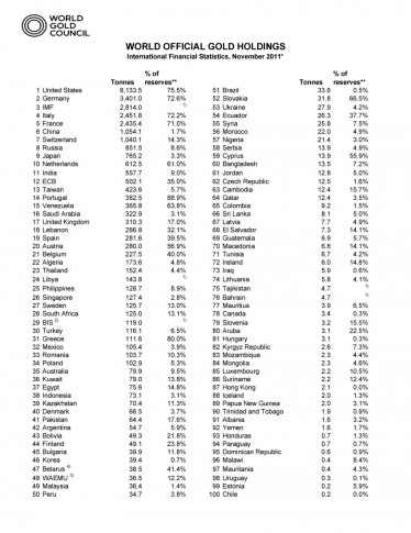 Slovenija je po podatkih (oktober 2011) družbe World Gold Council s 3,2 tonami državnih rezerv v zlatu na 79 mestu v svetovnem merilu. Vse večjo dinamiko kupovanja zlata ima Mehika, ki je do avgusta letos k monetarnim rezervam dodala 98,3 tone zlata, Rusija 56 ton, Tajska 37,3 tone, celo Srbija 0,5 tone (predvideno iz rudnika Bor).